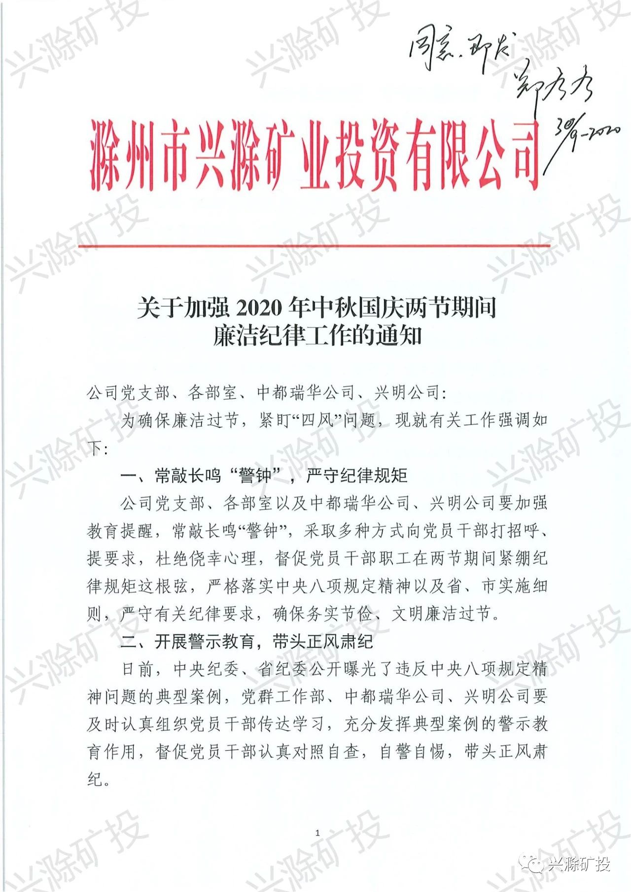 市礦投公司關(guān)于加強(qiáng)2020年中秋國慶兩節(jié)期間廉潔紀(jì)律工作的通知