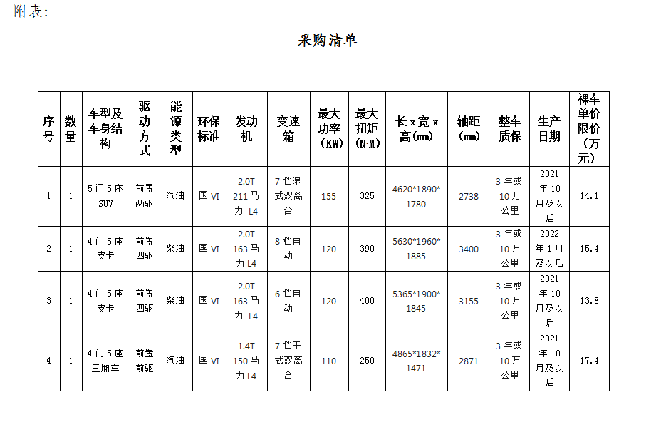 1.根據(jù)業(yè)務(wù)發(fā)展需要,滁州市興元商貿(mào)有限公司擬集中采購(gòu)業(yè)務(wù)保障車(chē)輛共計(jì)4輛,詳情見(jiàn)附表。