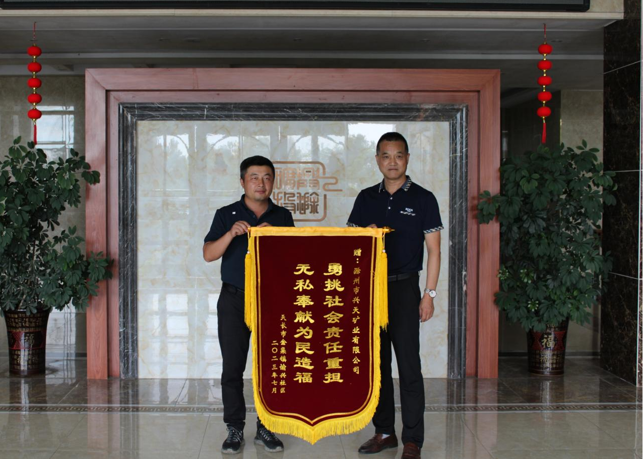 7月17日,天長(zhǎng)市金集鎮(zhèn)諭興社區(qū)將一面印有“勇挑社會(huì)責(zé)任重?fù)?dān),無私奉獻(xiàn)為民造福”的錦旗送到了興天礦業(yè)。